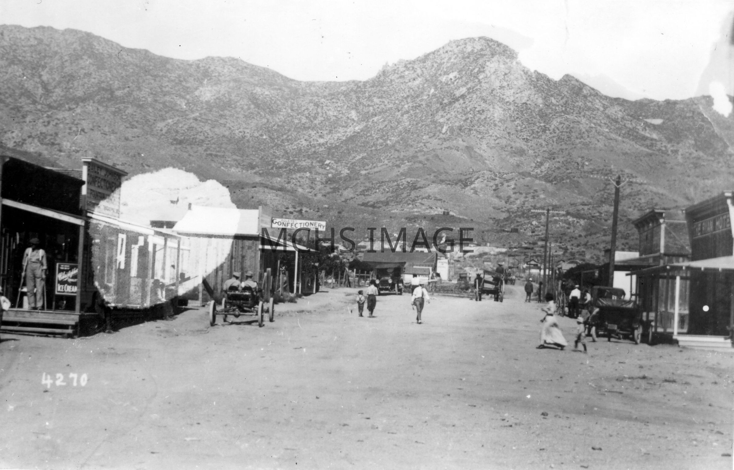 Looking east up Tennessee Ave. in Chloride to Tennessee Mine (at white dump). Left to Right: 1) unknown, 2) Bailey Johnson confectionery and fountain lunch 3) unknown 4) Foley's confectionery store 5) unknown 6) hotel 7)Tennessee Mine 8)Telephone company 9) Ryan HotelCollection