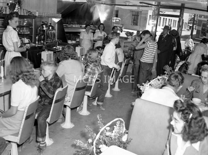 The opening of the Chocolate Shop. There are several flower arrangements, the booths and counter are filled with customers. There are three waitresses behind the counter, more people coming in the door. 4th St. between Oak and Beale Sts.Collection