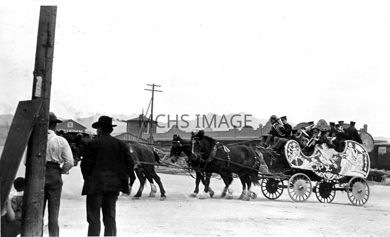 Photograph of circus parade wagon crossing 4th Street in Kingman. Note the Santa Fe train station in the background. Date unknown.Collection