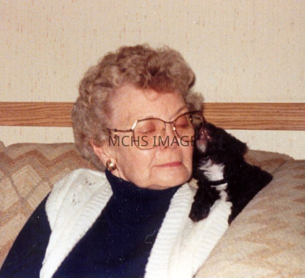 Photo of Cleo Dailey Brown and Cat taken in 1990's, Cleo was the Service Club manager 1942-1945 at Kingman Army Air Field.Collection