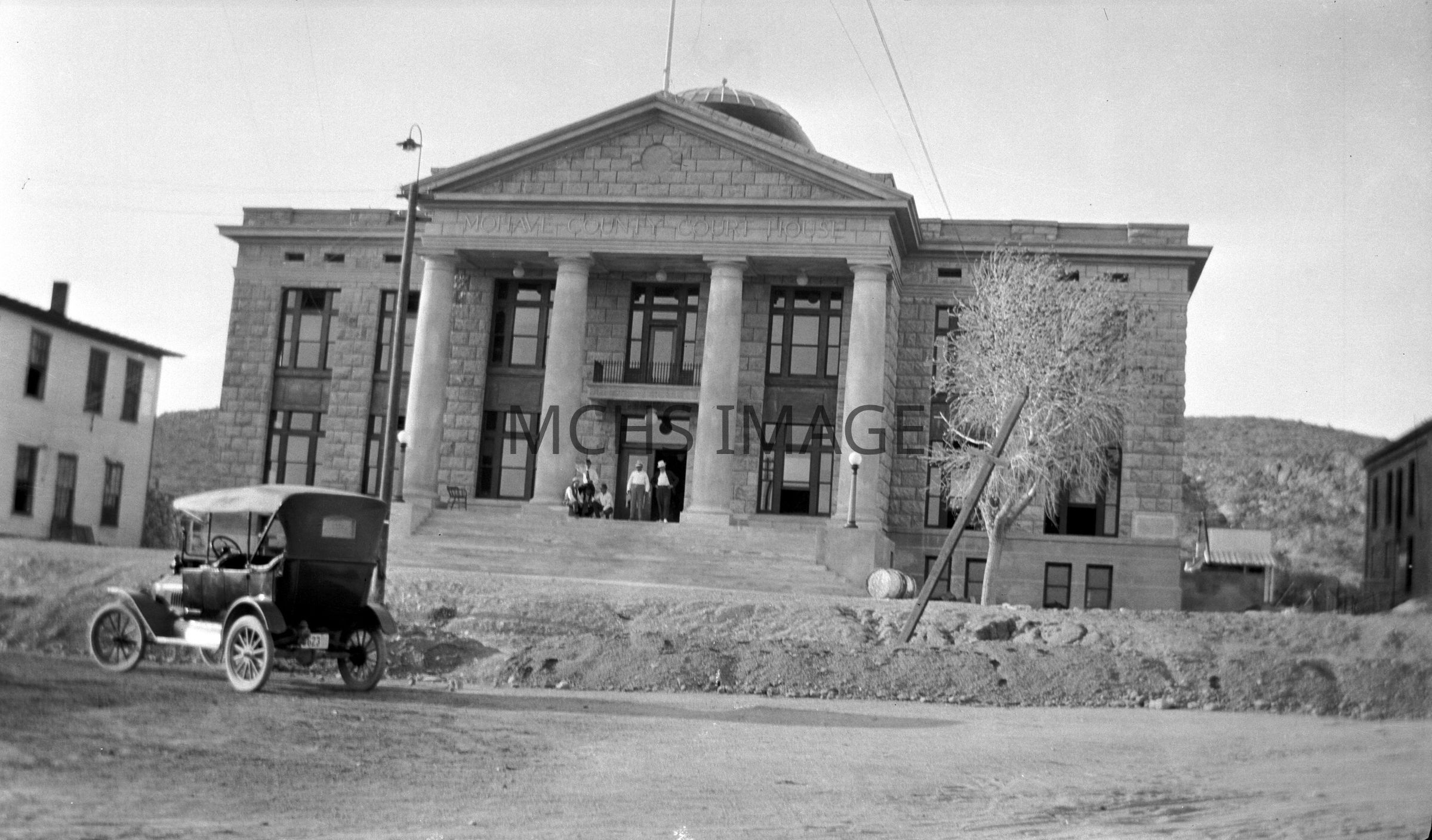 Close-up of Courthouse, completed, car in front, people on steps.Collection
