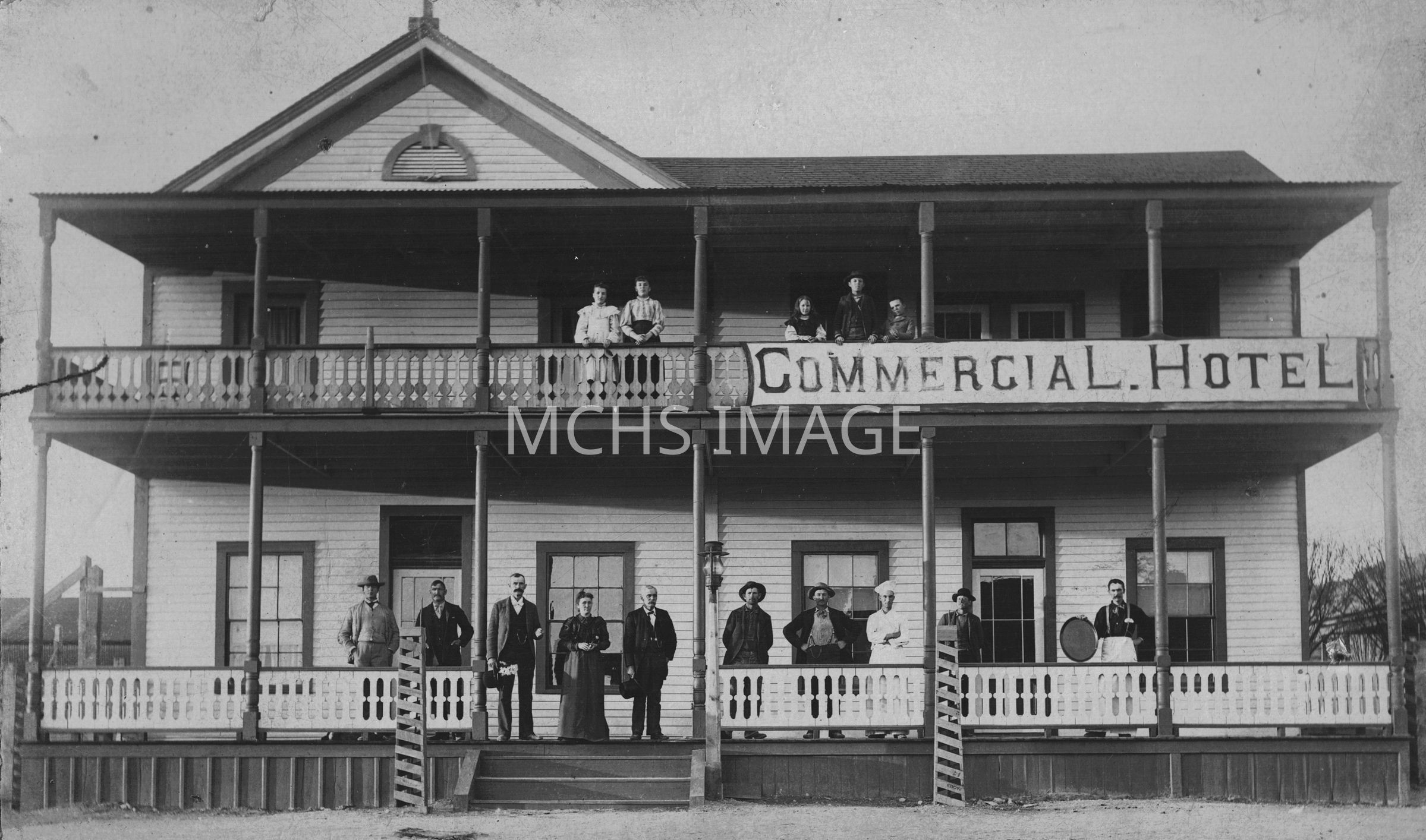Commercial Hotel (after 1915). Hotel was run by Mary Eleanor Cohenor. People downstairs are (LtoR) Dr. A.M. Cowie, Mr. Stub Boner, Jacob Neff Cohenour, Mary Eleanor Cohenour, Rev. Joseph Cohenor, 2 men bulding Lake's Hall, Henry Lang, stranger, and Henry Joshling. Upstairs, Nina May Cohenour, Minnie Pearl Cohenour, Nora Brewer, Charley Roe, Fredrick Lawrence Cohenour.Collection