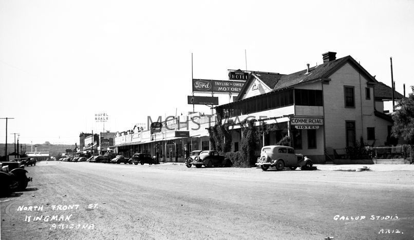The Commercial Hotel building. It was torn down in early 1947. There is landscaping in front and many cars parked on the dirt road. The Hotel Beale sign is in the distance. Front Street (Andy Devine)Collection