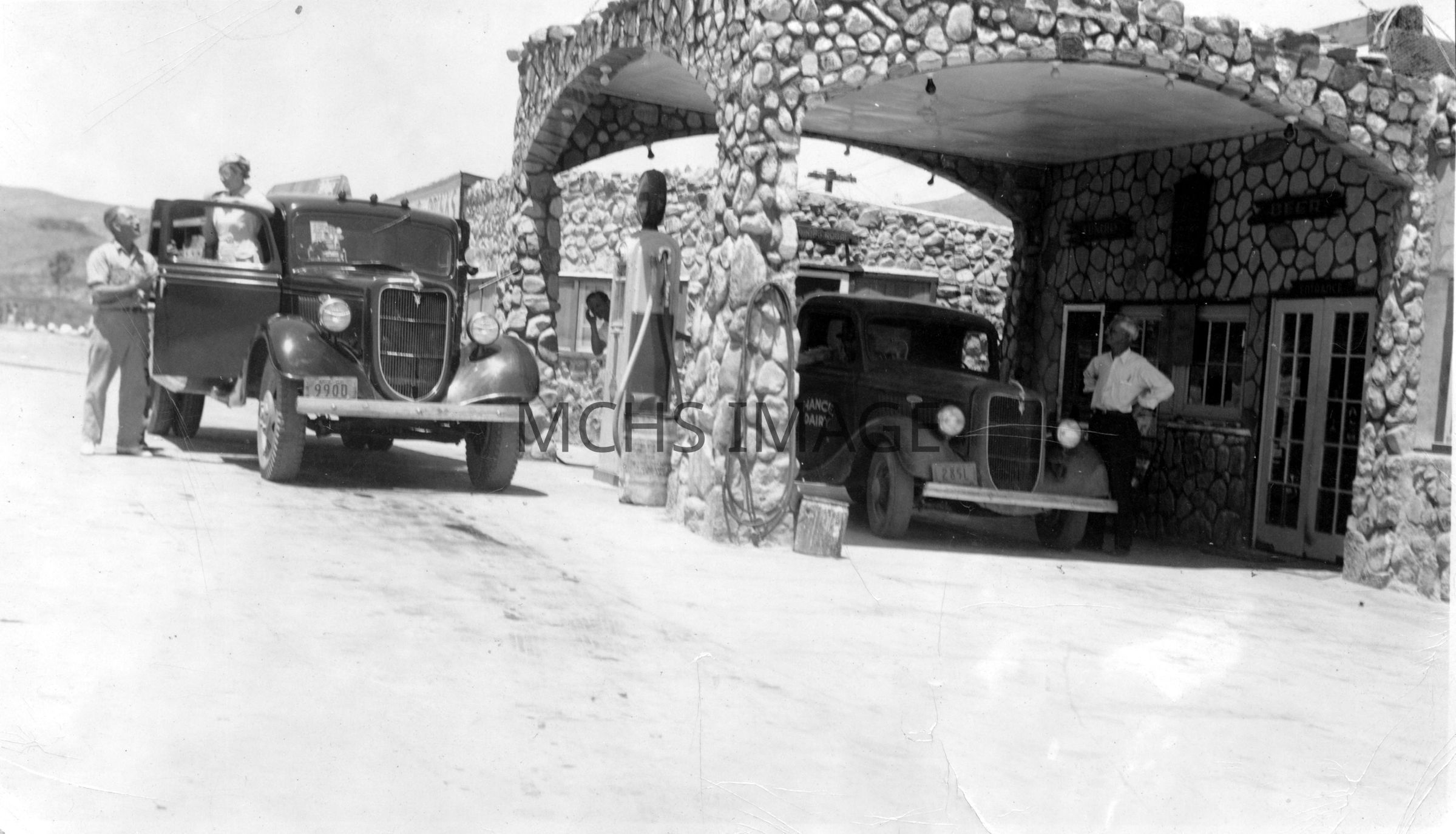Floyd Spidell delivering to Cool Springs, Mary Walker (James wife) standing in truck. Two trucks, also with a man standing by truck, at Cool Springs service station.Collection