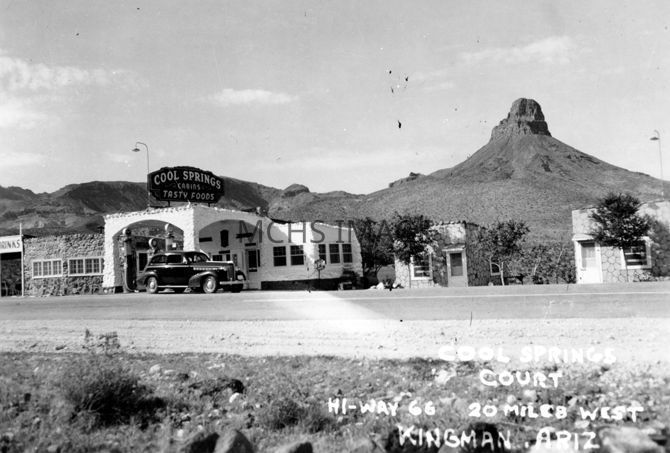Auto Court, service station and restaurant. A car is parked in front by the gasoline pump. Located 20 miles west of Kingman on Highway 66.Collection