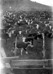 Corral east of service station at Peach Springs. They were rounded up and some sold. Each Indian had his own brand.Collection