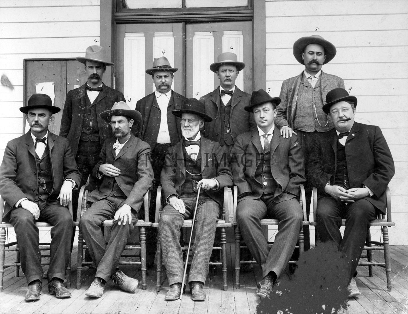 County officials takin on porch of old courthouse. Seated l to r: Jno. P. Feeney-Recorder and clerk of the board 1899-1904, Ross H. Blakely-Co. Atty 1923-27, J. A. Logan-School Supt. Probate judge/superintendent of schools 1896-1902, H. L. Dickerson-Atty, Foster H. Dennis-Supv. And county treasurer 1906. Back row l to r: Walter Brown, Sheriff 1905-12, John Bomhoff, J. P. Gideon, Sheriff 1913-14, Henry Lovin, Supv.Other Names and Numbers