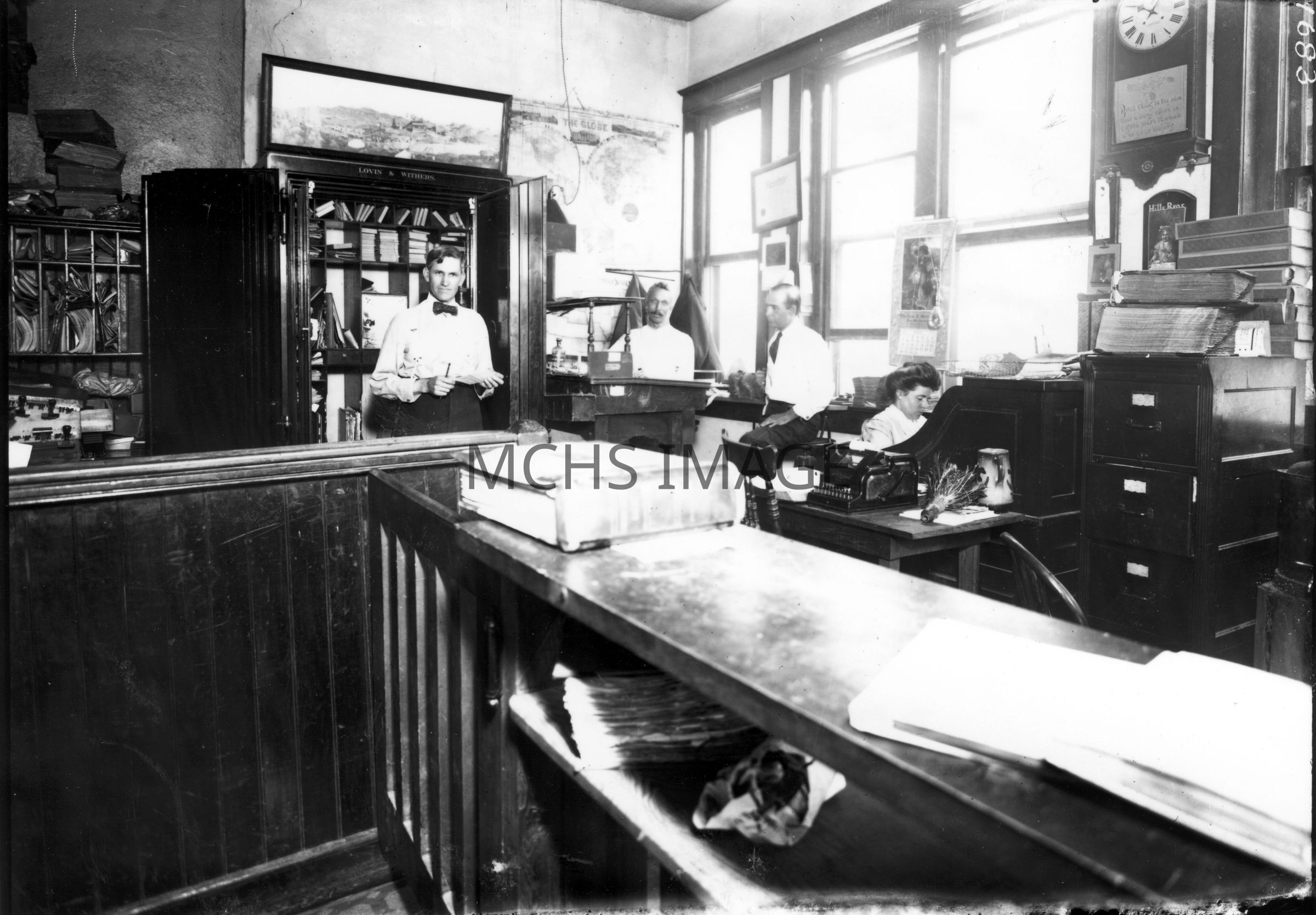 Two men and a lady behind the counter in the courthouse