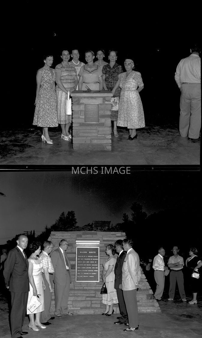 Photograph of the dedication of the Beale Monument taken 30 June 1956 in Locomotive Park located on Beale Street between First Street and Grandview. In picture are Soroptimist Ladies, Left to right, unknown, Elizabeth Hafley, Clara Quartier, Louise Kykendall, Elsa Sweeny, Bernice Richardson, Mrs. Essig.Collection