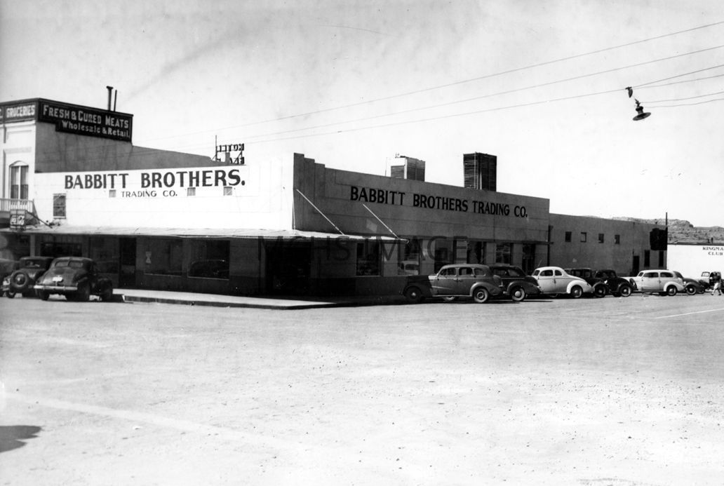 Several cars are parked in front. The Kingman Club Bar is on the right. A Coca Cola sign is on the left of the Babbitt building, the Hotel Beale sign can be seen in the background.Collection