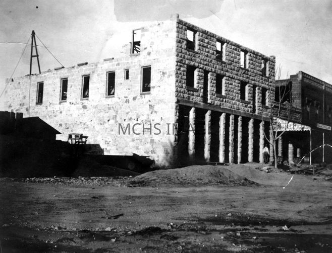Mulligan-Thompson building under construction 1909 later known as Brunswick Hotel Kingman's first 3 story building. Note Beale Hotel on right with one story Lovin Building between. Look same 1987. Front Street (Andy Devine)Collection