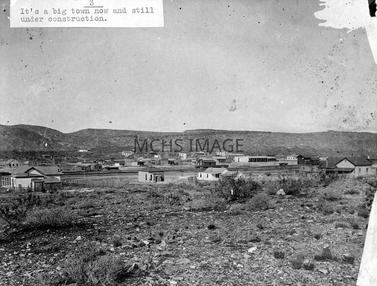View of Early Kingman, with construction. Kingman Hotel on Beale and 4th Street (large two story building with white colored right end.)Collection