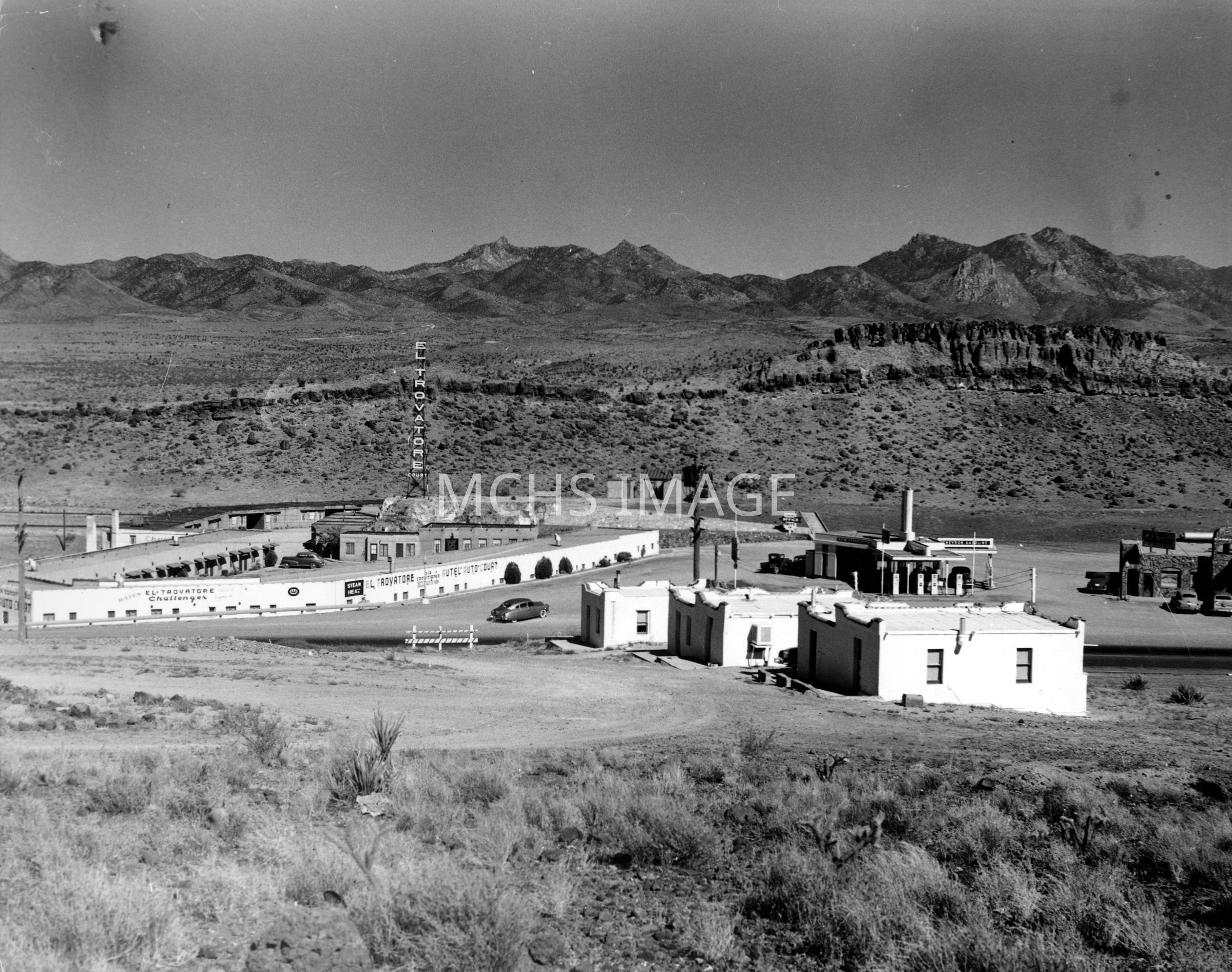 The El Trovatore Court surrounded by desert. A Chevron Station is in the distance, a lone car is parked on the dirt road.Collection
