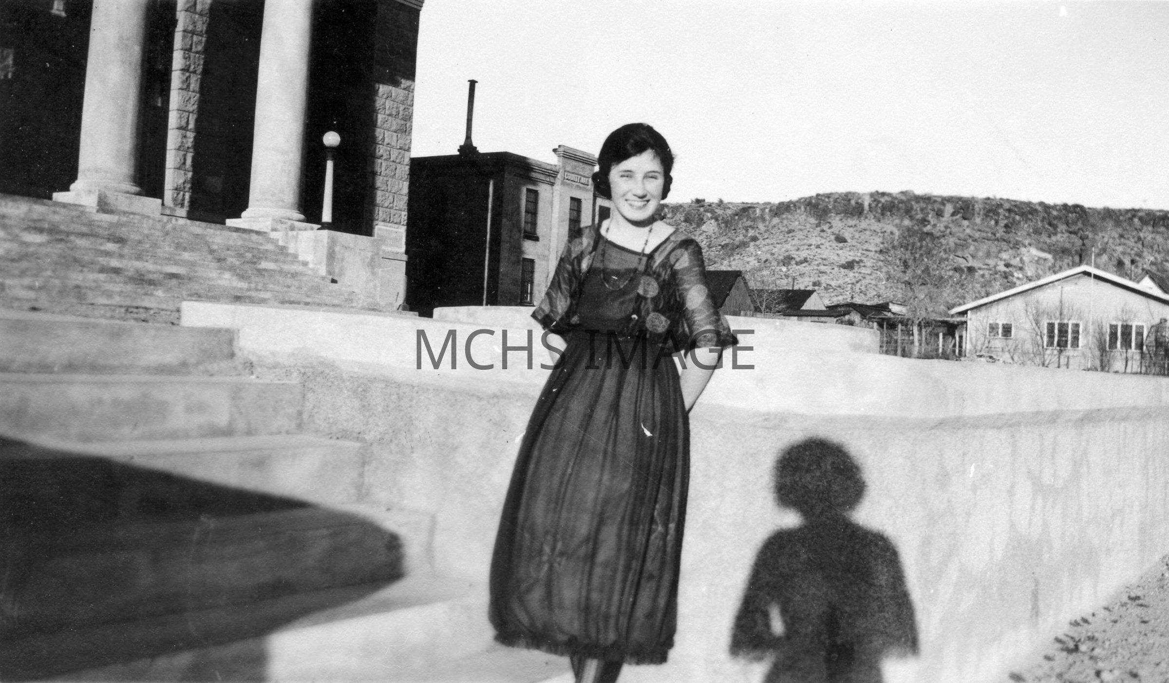 Emma Bale, taken in front of Courthouse. House at right is the Cofer Home.