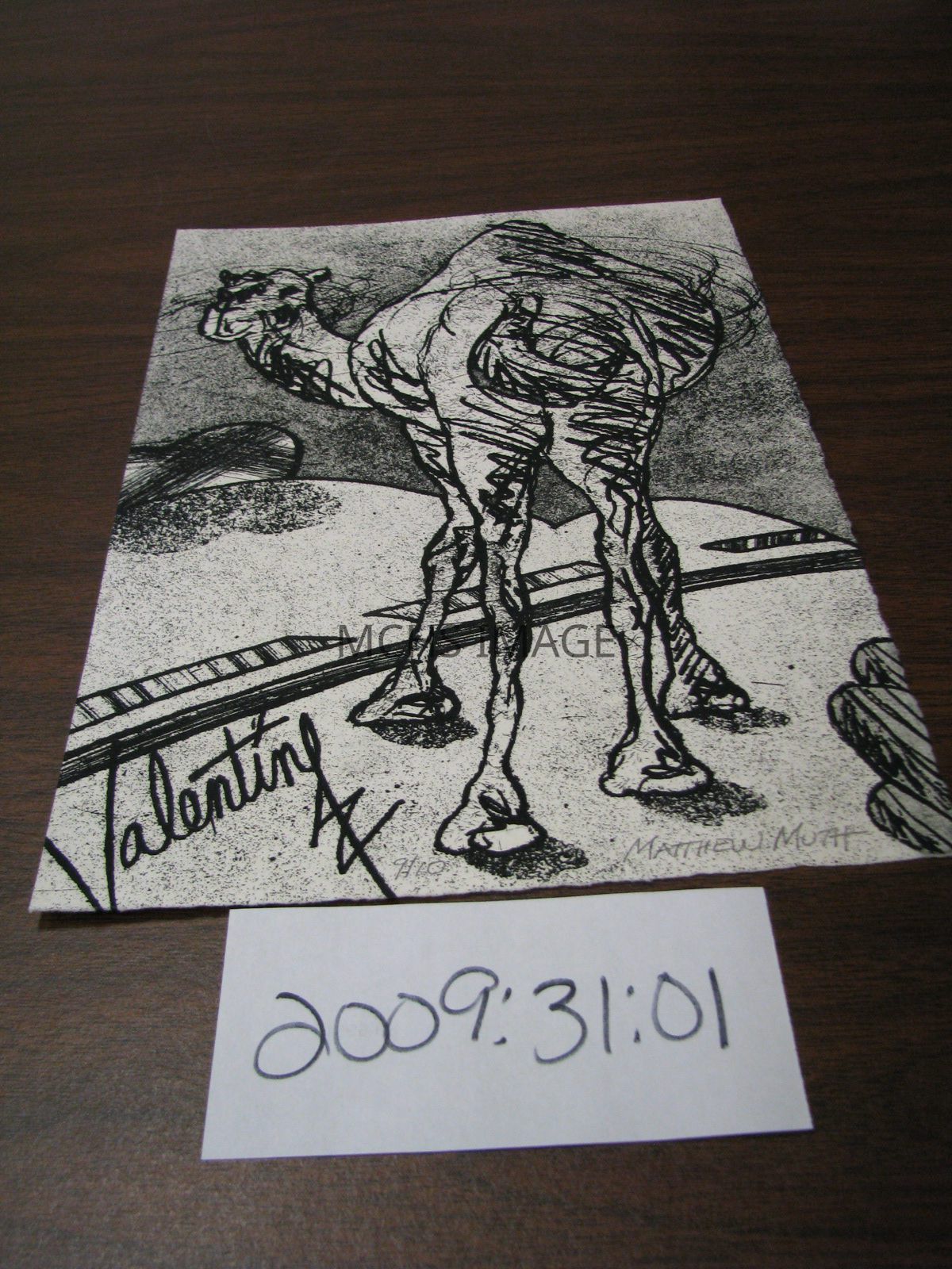 Print (etching), 7-1/2" x 11-1/4", in excellent condition. A black & white sketch of a camel on a roadway (Route 66) with Valentine written in the lower left corner. Signed by the artist Matthew Muth and numbered 9 of 10. **Original etching was created in honor of the town of Valentine.**
