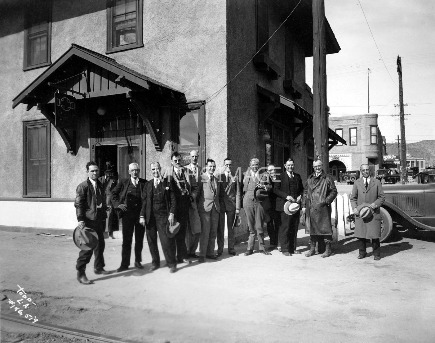 Exterior close-up of Harvey House. Several well-dressed men are standing in front. There is a car parked to the side; from l to r, Abe Bales is #7 and Judge Bollinger #8. SW corner 4th and Andy DevineCollection