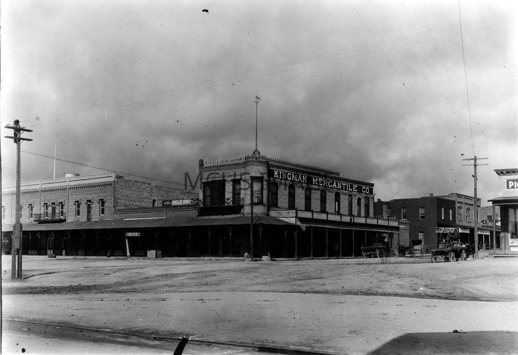 Exterior of Kingman Mercantile (Lake Bldg) and Hotel Beale. Snow on the ground and a cloudy sky. NW corner 4th and Andy DevineCollection
