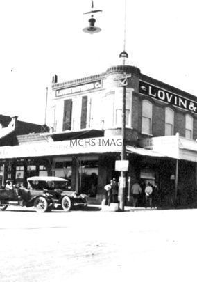 Exterior of Lake Bldg (Lovin & Withers Company). Two cars are in front and several people are standing on the corner. 4th and Front Sts (Andy Devine Ave.)Collection