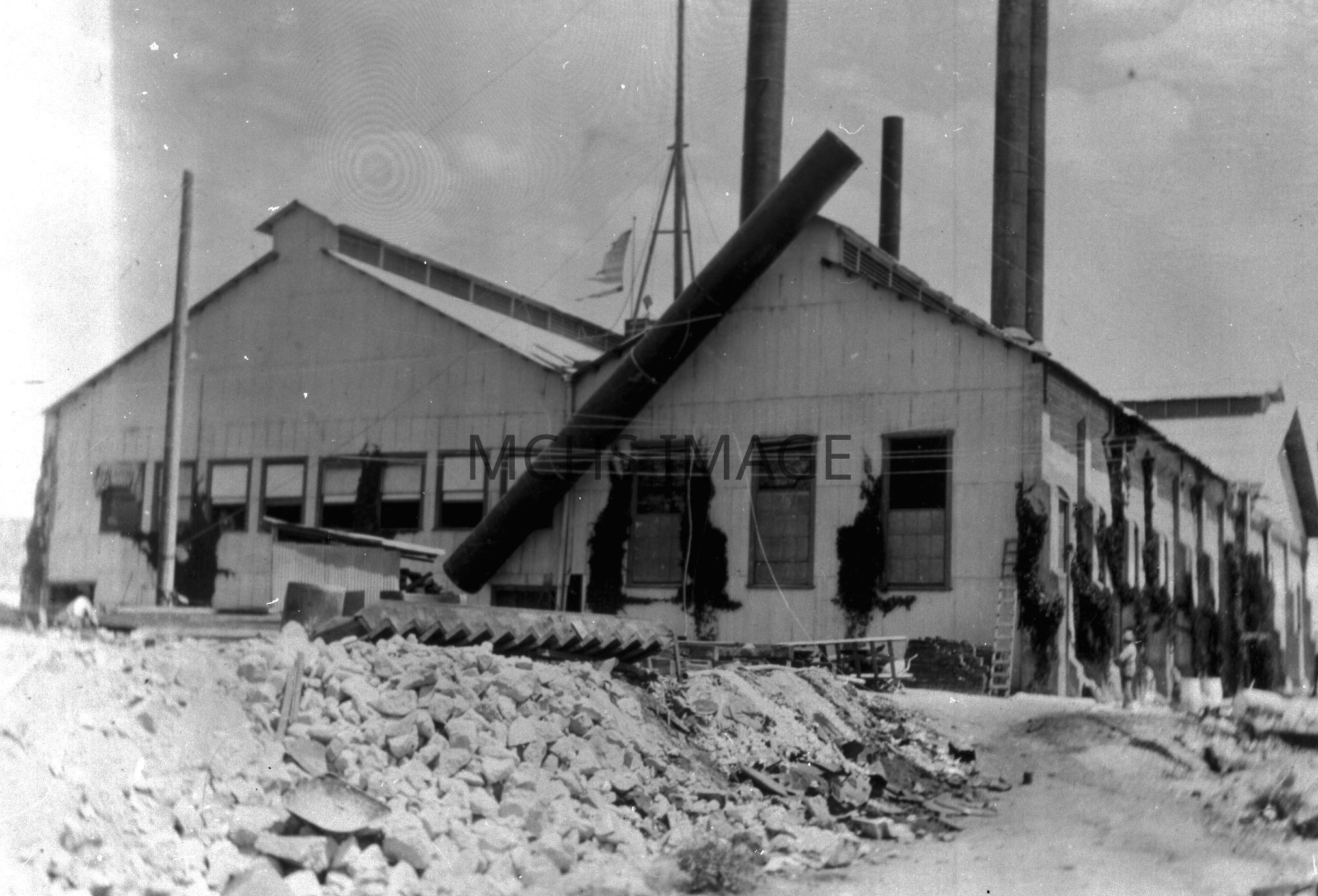 An exterior view of the Power Company. A stack is being raised onto the roof, ivy is growing around the windows, the area in front is dirt. Andy Devine and 1st St.Collection