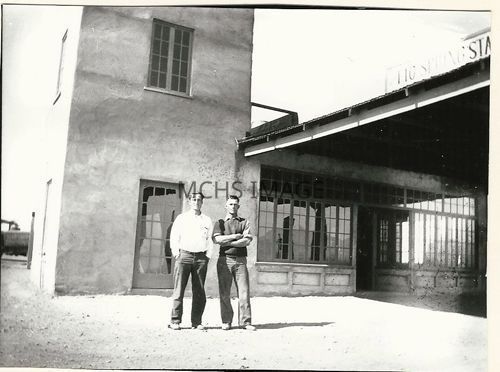 Two men are posing in front of the station. The sign reads "Fig Springs Station", there is a truck parked in back.Collection