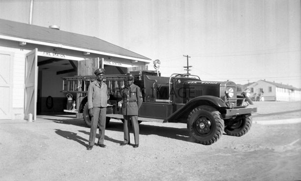 Photograph of fire truck at fire station at Air Field taken in 1943.