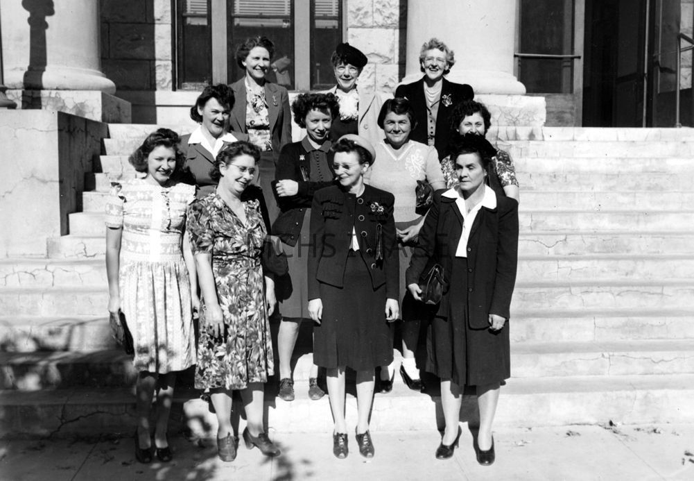 Taken on the courthouse steps. Row 1 l to r: Claudene Cox, Cora Castele, Katherine Johnson, Velma Goodale. Row 2 l to r: Gertrude Caughlin, Irma Cannon, Marie Bojorquez, Helen Lingen. Row 3 l to r: Catherine Thompson, Irene Venable, Helen Marie StofferOther Names and Numbers