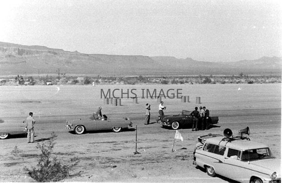 There are 4 cars, men standing around them, 2 loudspeakers are mounted on a station wagon. Barrels have been placed beyond the road.Collection