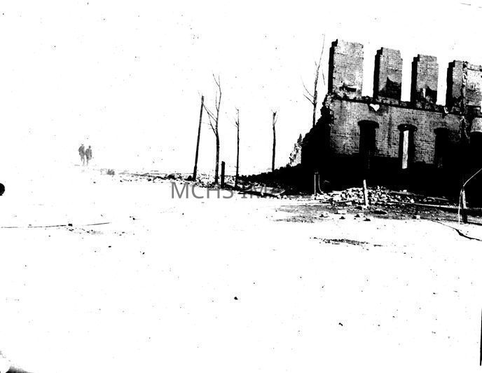 A photograph taken after a large fire which destroyed all the buildings between 3rd and 4th on Front Street except the Lake Building. The date is probably 1898. This photo shows the shell of a building.Collection