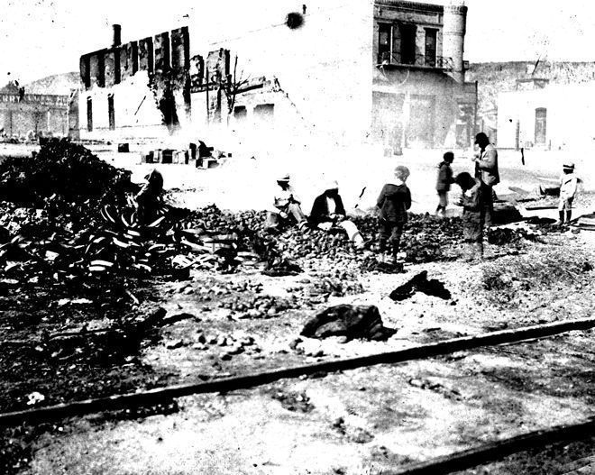 A photograph taken after a large fire which destroyed all the buildings between 3rd and 4th on Front Street except the Lake Building. The date is probably 1897. Lake Building is shown in the background. In the foreground some men and boys are picking over potatoes that were roasted in the fire and then dumped along the railroad tracks.Collection