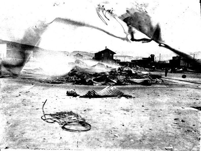 A photograph taken after a large fire which destroyed all the buildings between 3rd and 4th on Front Street except the Lake Building. The date is probably 1897. This photo looks toward the Santa Fe Railway station (two story building) and the railroad yard. Note caboose to right.Collection