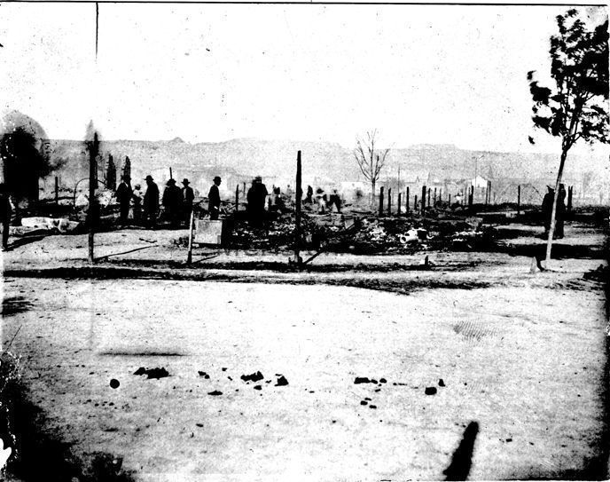 A photograph taken after a large fire which destroyed all the buildings between 3rd and 4th on Front Street except the Lake Building. The date is probably 1898.Collection