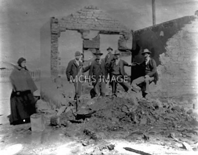 A photograph taken after a large fire which destroyed all the buildings between 3rd and 4th on Front Street except the Lake Building. The date is probably 1897. This photo shows several men and one woman in the burned out shell of one of the buildings.Collection