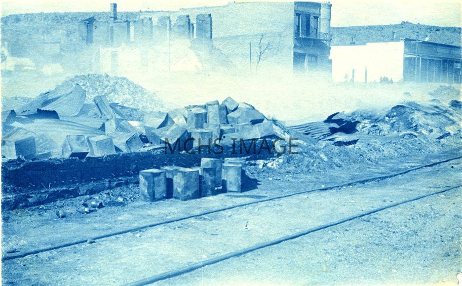 A photograph taken after a large fire which destroyed all the buildings between 3rd and 4th on Front Street except the Lake Building. The date is probably 1897. Lake Building is shown in the background.Collection