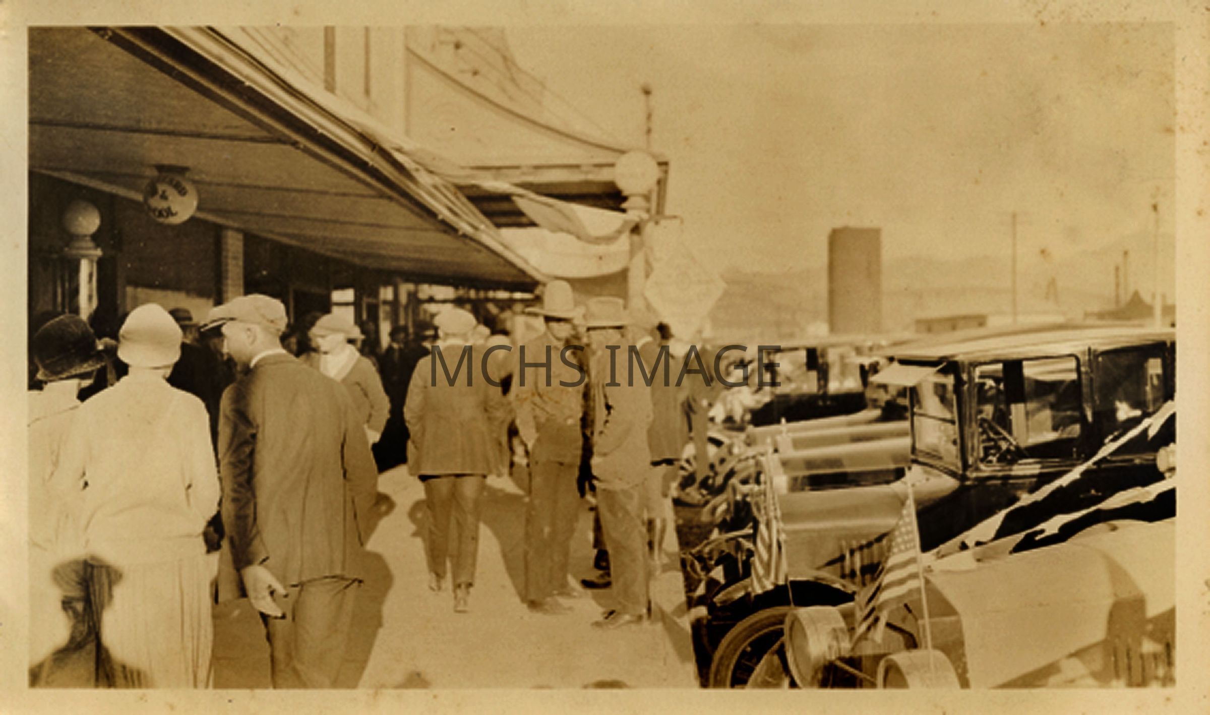 Street scene, Front Street, Kingman, AZ. Period handwritting on back "looking east on Front Street from about "Bill Ye" place" appears to be in area of Beale Hotel, Billiards & Pool sign and a barbers pole visible. "Bill Ye" is mentioned in an interview (1981) as " ...Below the City Drug Store. And Bill Ye and [name unclear] lived in the basement under the restaurant that was in the Brunswick Hotel Building"Collection