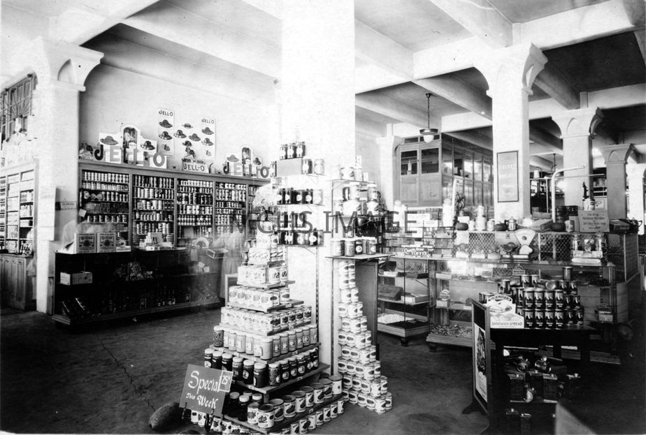 Grocery show room, with neat stacks of canned goods. A sign advertises "Special This Week 25 cents"; there are also signs advertising "Jello". A counter with scales is on the right. Beale StreetCollection