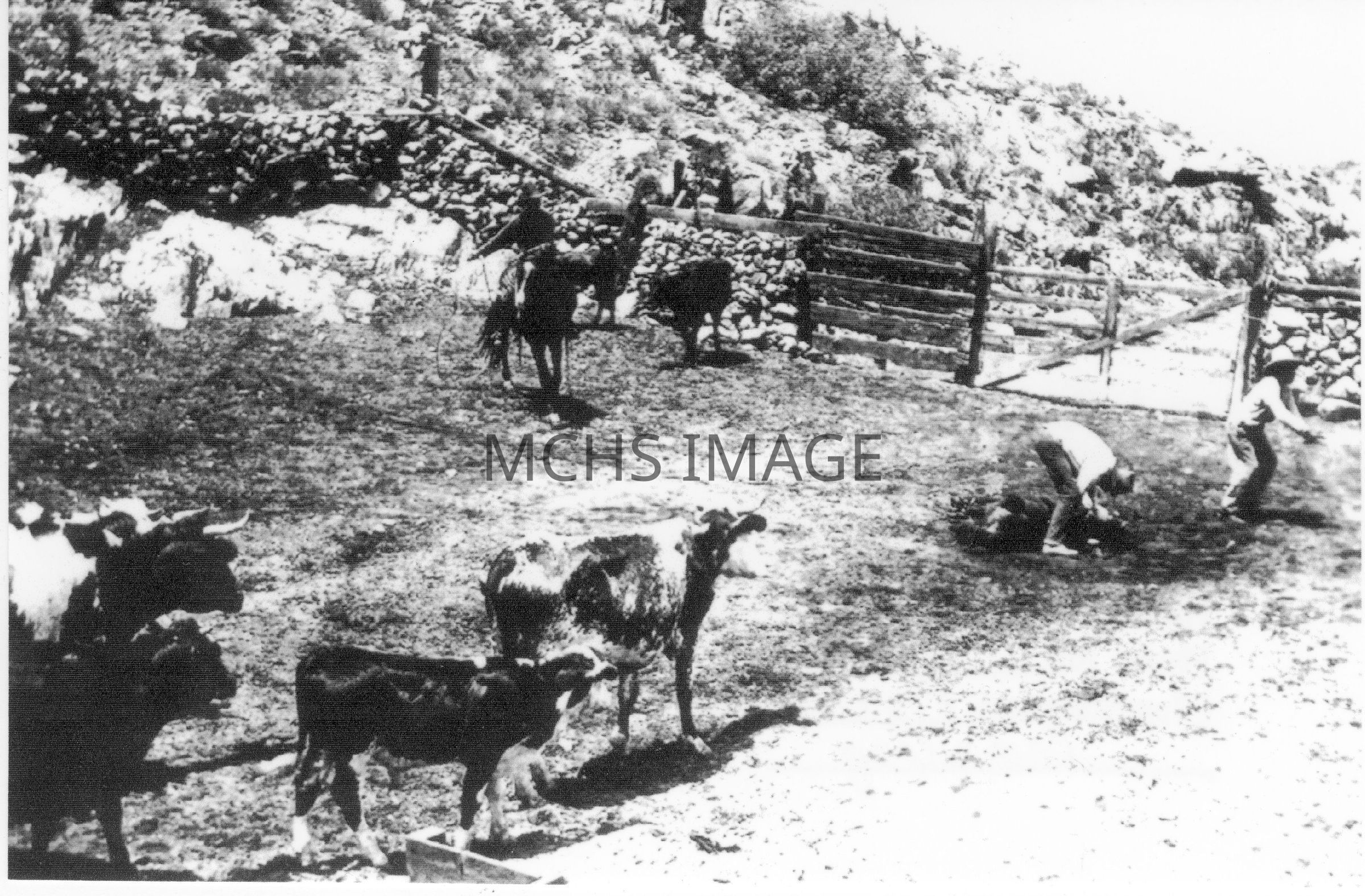 Branding cattle in old rock corral, Gross Ranch, Mineral Park