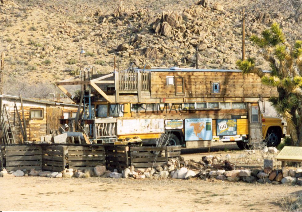 Old truck made into old camper with "Route 66" sign on side with hill in background.Collection