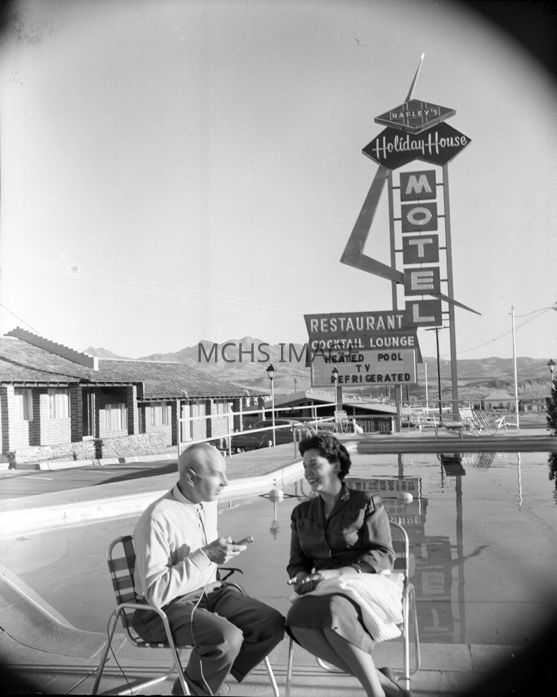 Two unknown folks enjoying the day in front of Hafley's Holiday House on North 93 Highway.Collection