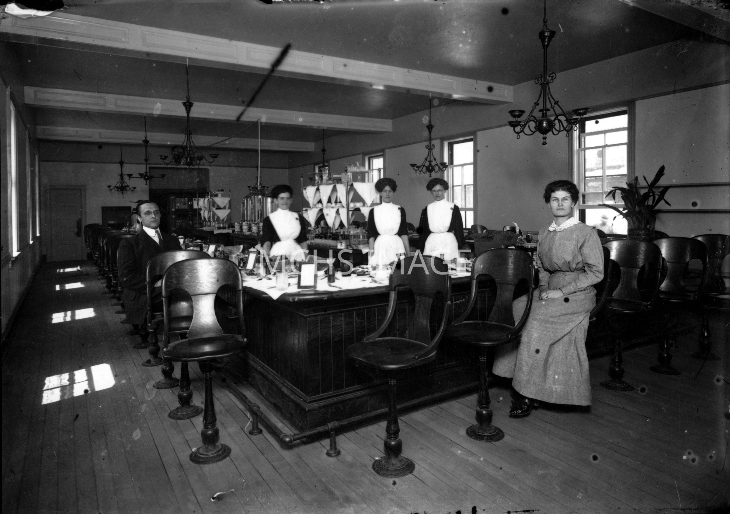 Interior of Harvey House at Seligman, Arizona. There are 3 waitresses and 2 customers sitting at counter stools.Collection