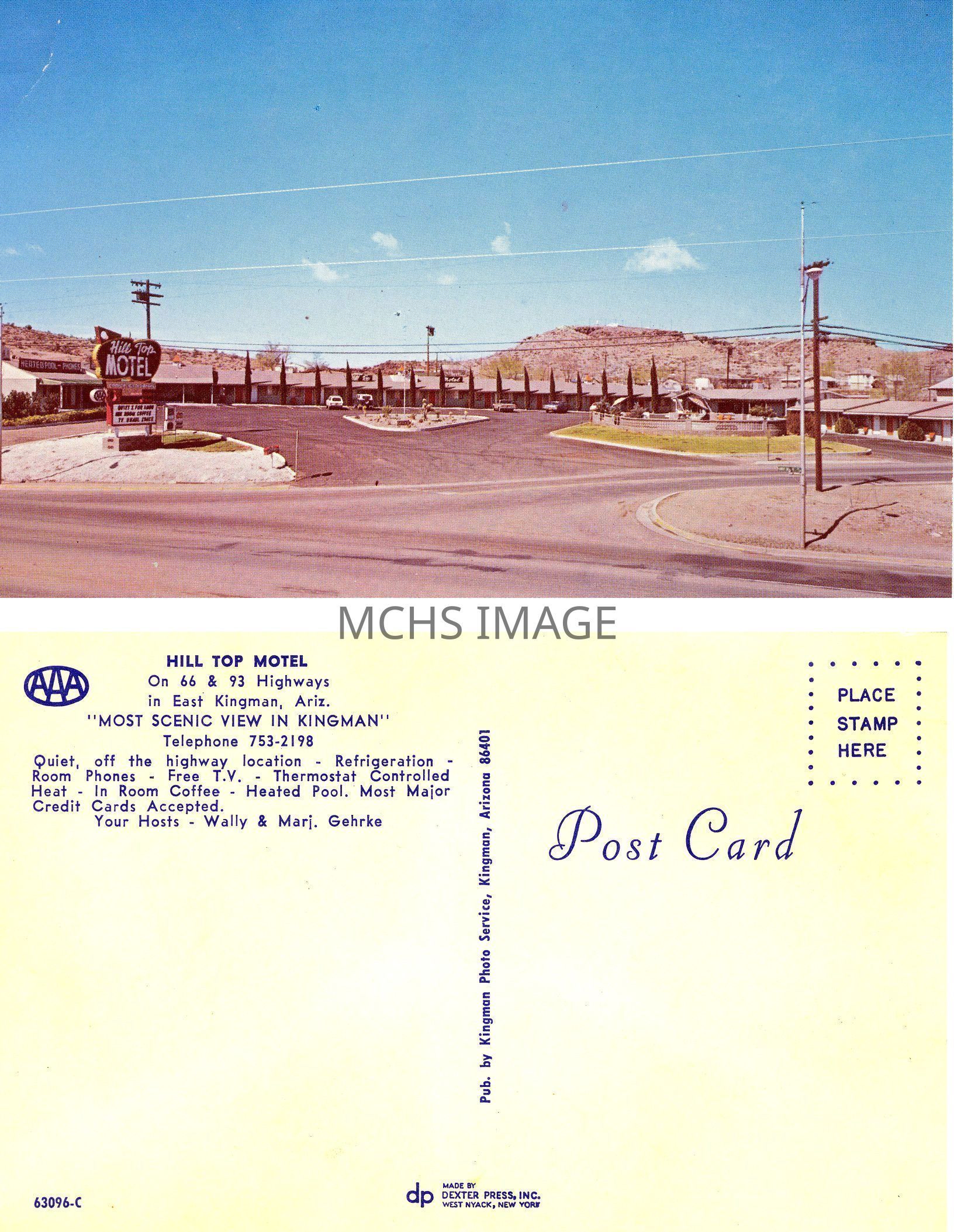 Panoramic view of Hill Top Motel with old base on motel sign.