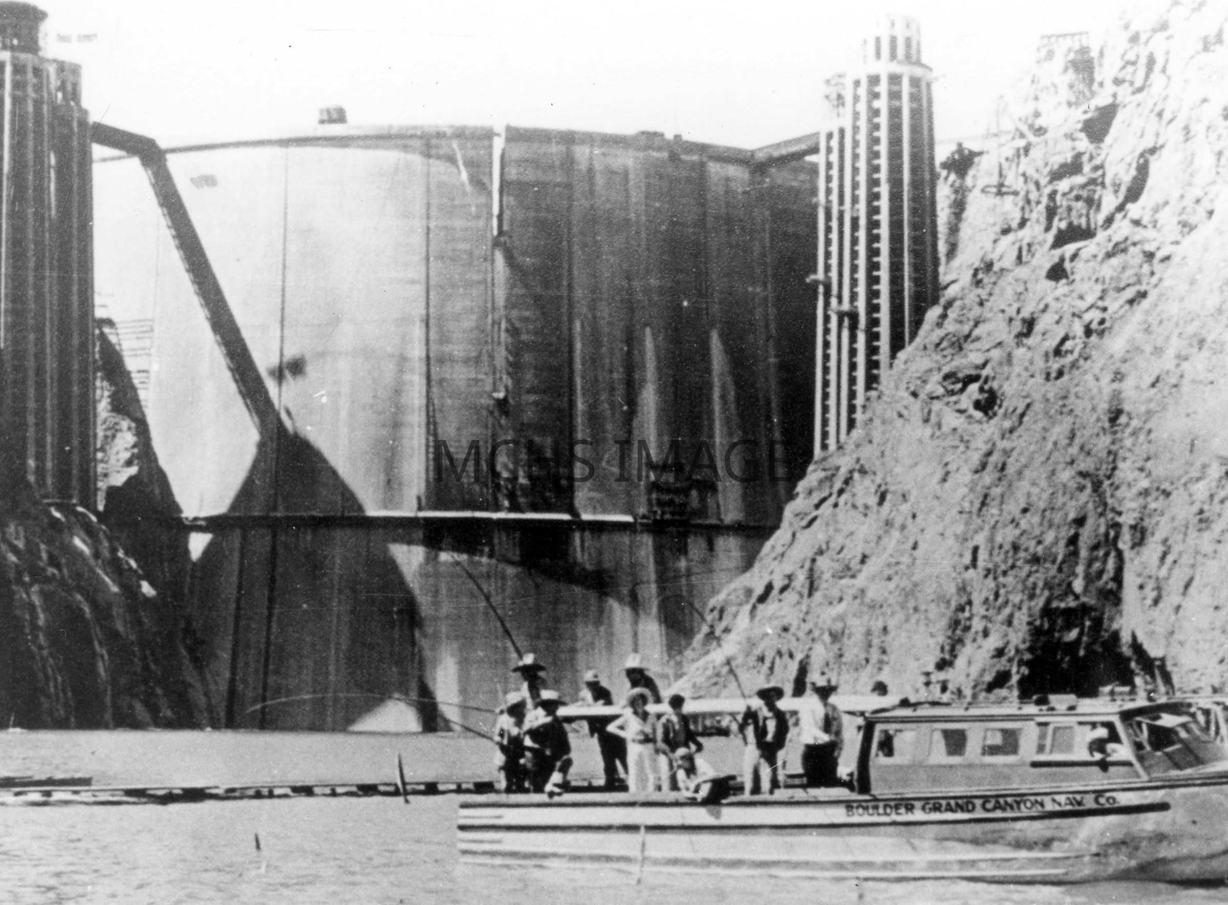 Men on boat below Hoover Dam