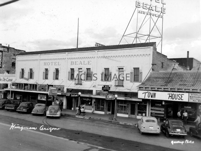 The Town House, Hotel Beale with cafe, The DeLuxe, and Hotel Brunswick Hotel are shown. There are 6 cars parked in front, the Hotel Beale advertises "air cooled".Collection