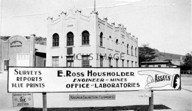 View of Ross Housholder sign, with IOOF building in background. Sign was at 5th and Beale.Collection