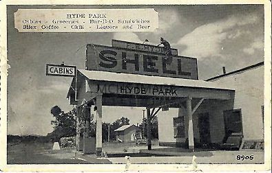 Hyde Park Shell Station, Caption: Hyde Park Cabins-Groceries-Bar-B-Q-Sandwiches-Silex Coffe-Chili-Liquors & Beer. PostcardOther Names and Numbers