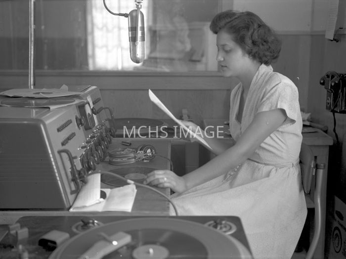 Inside KGAN radio station. Miss Catherine Covarrubis, announcer is reading from a script with radio equipment and records.Collection