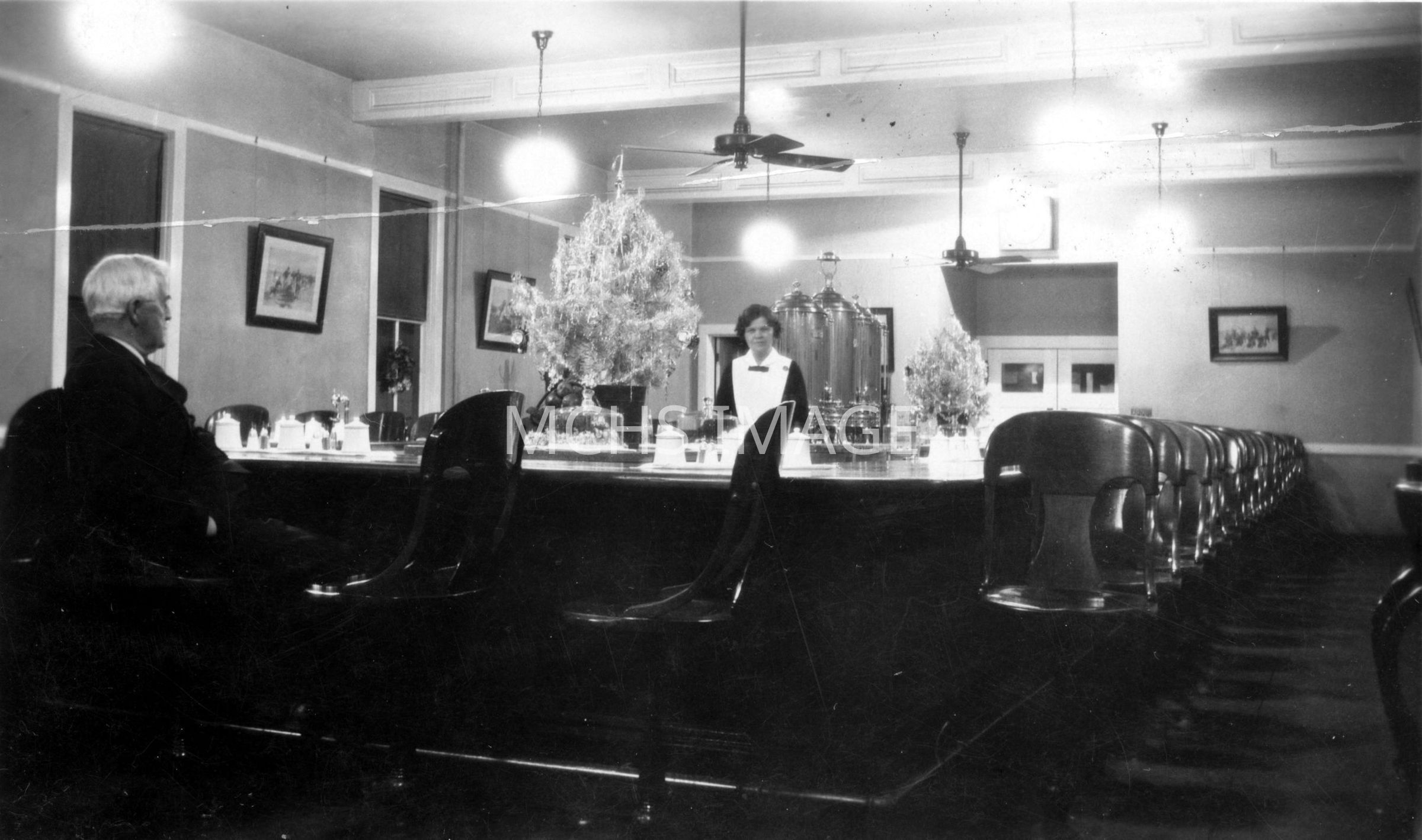 Interior showing counter with revolving stools. A Harvey Girl is behind the counter, a man on a stool. The room is well lit with a ceiling fan.Collection