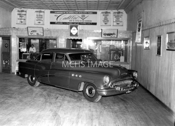 Interior of Old Trails Garage, a 1951 Buick Super is parked in the showroom and a man is at the service counter. Cadillac cars are advertised. Andy Devine (Front St.) between 4th and 3rd StreetsCollection