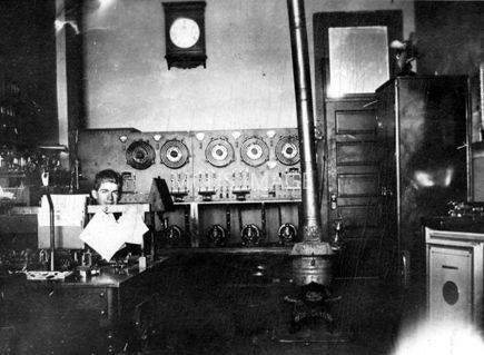 Interior of the Western Telegraph Co. office, which was then the company repeater station. This office was an important communication center for Kingman, as all outside news came by telegraph to Kingman through here. At times there were as many as two operators on day time duty, and three messenger delivery boys were needed to deliver telegrams and handle A.D.T. service ( a delivery by telegraph). At the "wire" in this picture is student operator and also messenger boy, Glenn H. Johnson. informant: Glenn JohnsonCollection