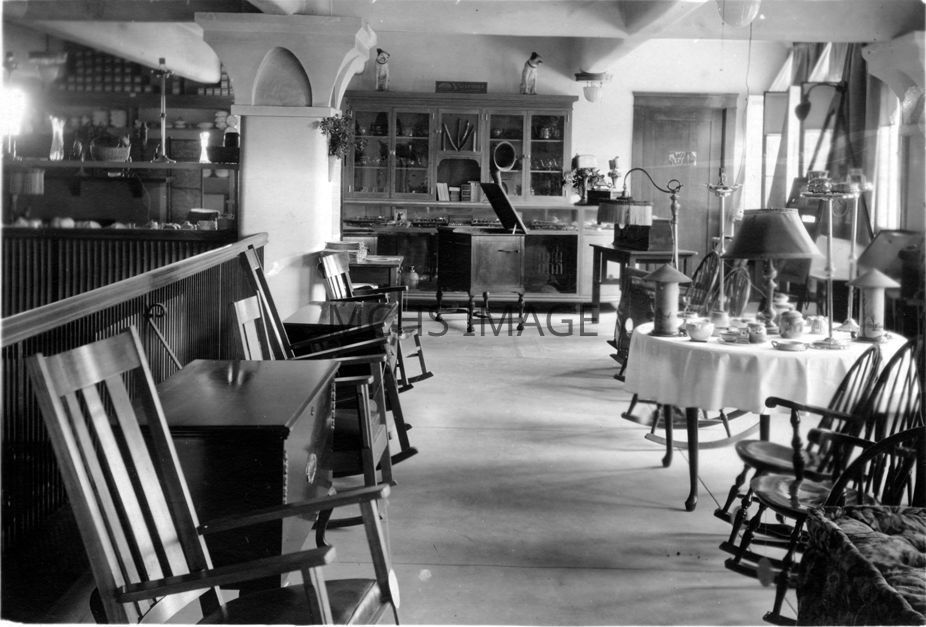 Interior view of mezzanine which was the furniture department. There is a nice display of chairs, chests, lamps, and a table set with dishes. Beale St.Collection