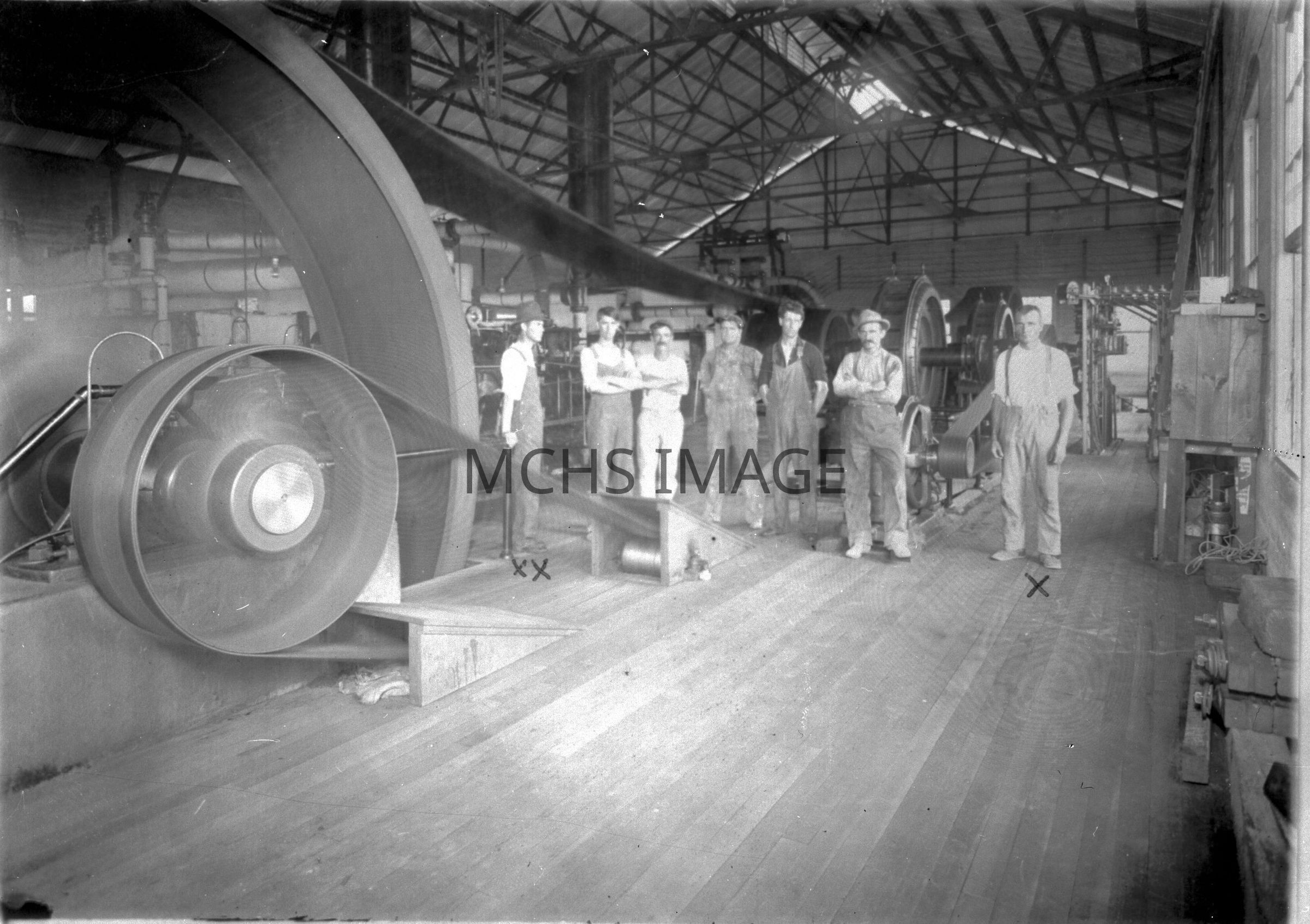 An interior view of the Power Company. Seven men dressed in work clothes are standing near the main flywheel for the shafting which drove the generators. Andy Devine (Front Street) and 1st St.Collection